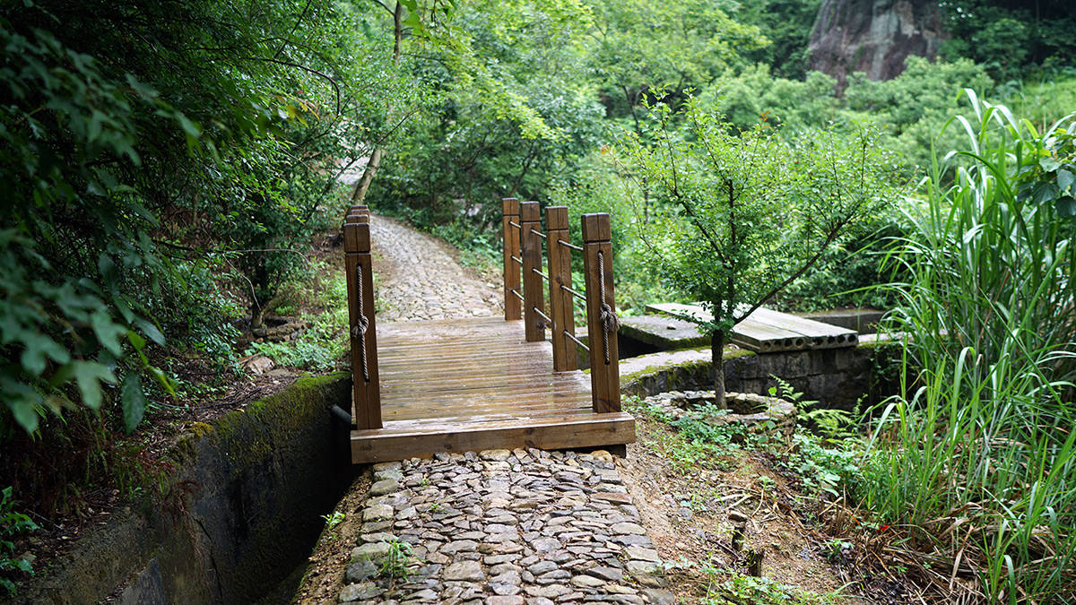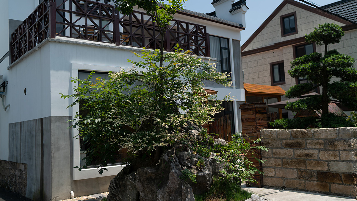 走到村口,首先映入眼帘的便是两棵百年香樟树,左侧是围湖公园,曲径回廊、亭台楼阁错落有致,映衬着山的倒影,迷离秀美。再向里走,便是村舍,一座座各有特色的民宿分散在村中。