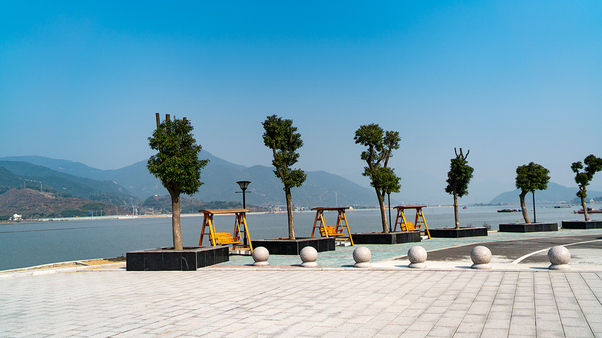 村旁建有一个海景玻璃栈道,站在观海平台上,近可观美丽的蟹钳港,让你一览蟹钳港的全貌。如果天气晴好,也可远可眺大目湾的海上日出。