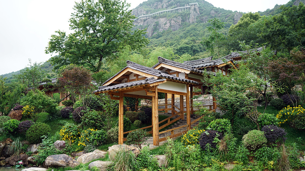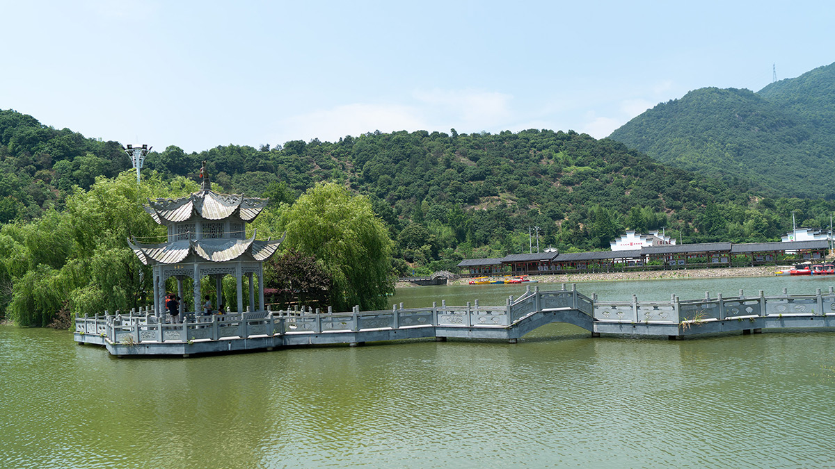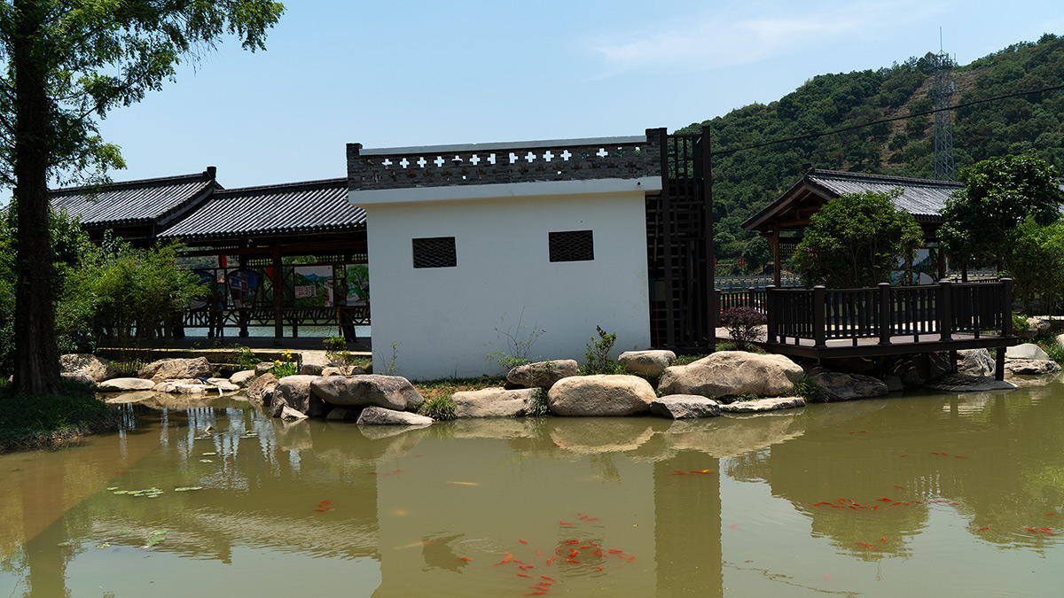 走到村口,首先映入眼帘的便是两棵百年香樟树,左侧是围湖公园,曲径回廊、亭台楼阁错落有致,映衬着山的倒影,迷离秀美。再向里走,便是村舍,一座座各有特色的民宿分散在村中。