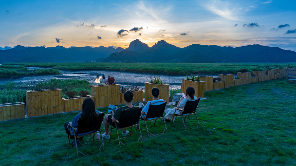 在滩涂上填土建成的的花间咖观景平台,既是咖啡馆,也是露营地。对面便是奇秀灵岩山,可坐在躺椅上,观山海,看潮起潮落,晚上则观星赏月,听海风在耳畔轻声细雨。